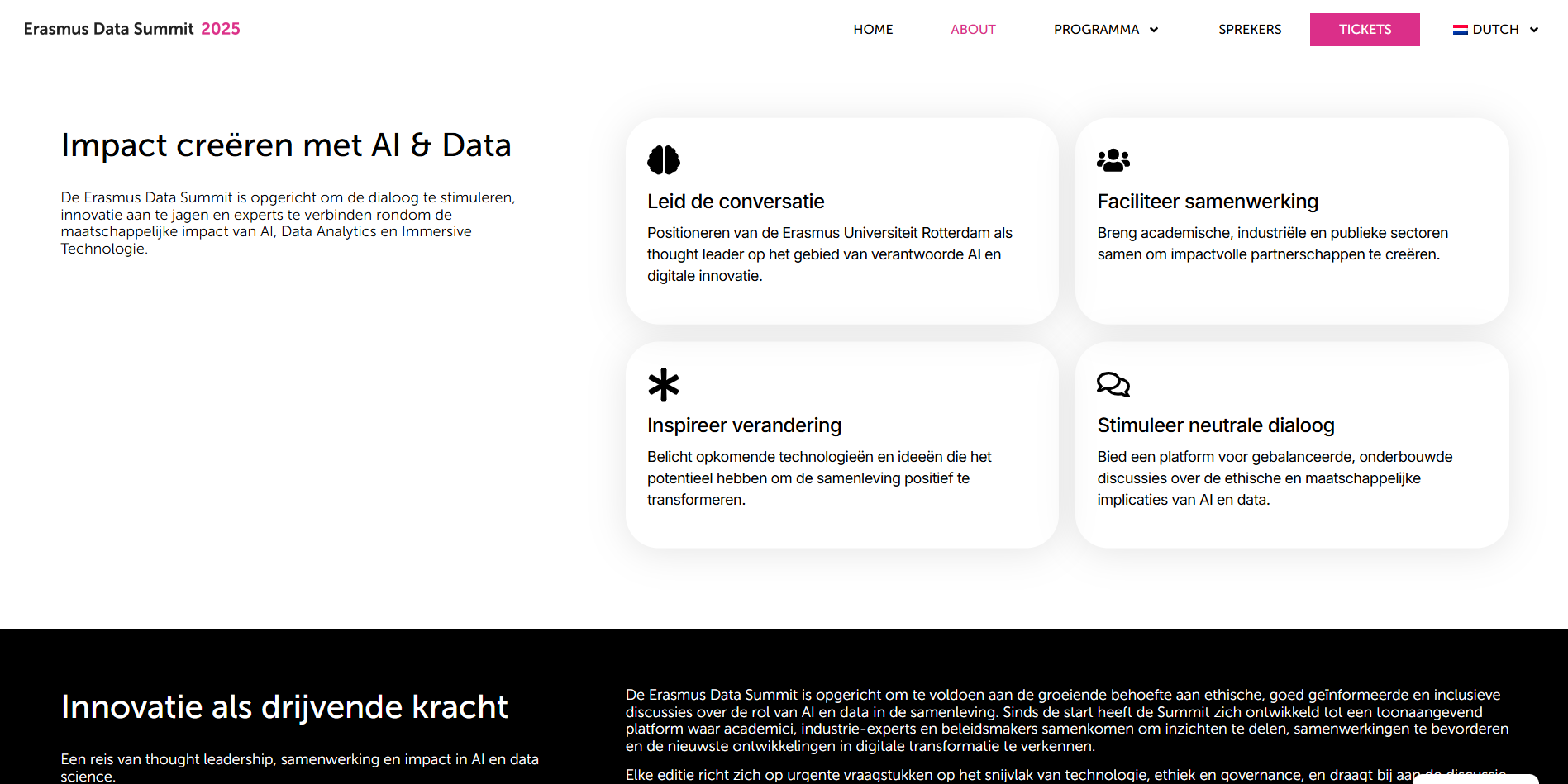 Design, development and copywriting for the official website of the Erasmus Data Summit. It is a repetitive conference-like event, this year’s edition being about AI & Digital Society. Created in collaboration with Erasmus Centre for Data Analytics with a focus on clarity, attendee experience and adaptability across desktop and mobile.